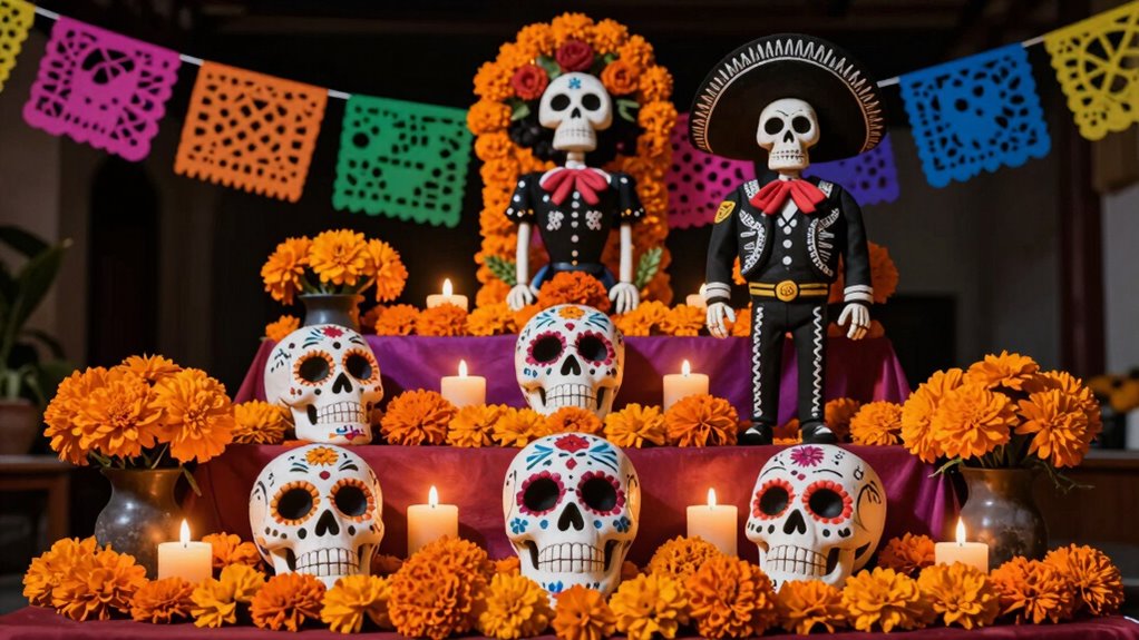 Many people around the world mistakenly view Mexico’s ‘Day of the Dead’ as a somber occasion or simply a Halloween-inspired celebration. In reality, it’s a vibrant, joyful event that honors loved ones who have passed away. You might have seen images of colorful altars, decorated with marigolds, photographs, and offerings. But one of the most iconic symbols of this tradition is the sugar skull. These intricately decorated skulls symbolize the departed and are a key part of the sugar skull traditions. They’re often crafted with bright colors and detailed designs, representing the personality and spirit of the deceased. Rather than being morbid, they embody a celebration of life and remembrance. The tradition encourages you to remember your ancestors with positivity and gratitude. Cultural significance underscores the importance of celebrating life rather than mourning death in this holiday. Cemetery celebrations are another common misconception. Many assume that the only way Mexicans observe the Day of the Dead is by visiting graves. While cemetery visits are indeed part of the tradition, they’re just one element of a broader cultural practice. During the festivities, families often set up altars at home, called ofrendas, which are decorated with photographs, favorite foods, drinks, and personal mementos of the departed. These altars serve as a welcoming space where the spirits are believed to return for a visit. When you attend a cemetery celebration, you’ll see families gathering to clean tombstones, light candles, and share stories. The atmosphere is lively and colorful, with music, dance, and communal joy. These cemetery visits are less about mourning and more about celebrating the lives of those who have gone before. Understanding these aspects helps you appreciate the true meaning behind the Day of the Dead. It’s not a day of grief but a cultural expression rooted in love, memory, and celebration. The sugar skull traditions and cemetery celebrations work together to create a lively, meaningful experience that unites families and communities. When you see the vibrant decorations, hear the cheerful music, and witness families sharing stories at grave sites, you’ll realize that this holiday is a powerful reminder of the enduring connection between the living and the dead. It’s about honoring ancestors with joy rather than sorrow, embracing life’s cycle with color, creativity, and respect. By dispelling these misconceptions, you can better understand and appreciate the true spirit of Mexico’s most cherished celebration.