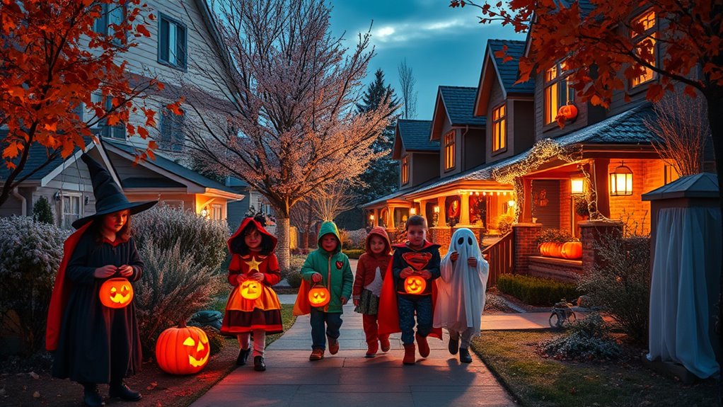 In Canada, Halloween celebrations light up cities and neighborhoods with lively decorations, creative costumes, and spooky attractions. You’ll see people dressing up as everything from classic monsters to current pop culture icons, often putting effort into themed outfits. Haunted houses, spooky trails, and community events like parades and contests add excitement for all ages. If you want to discover more about what makes Canadian Halloween so special, keep exploring the festive traditions that bring everyone together.