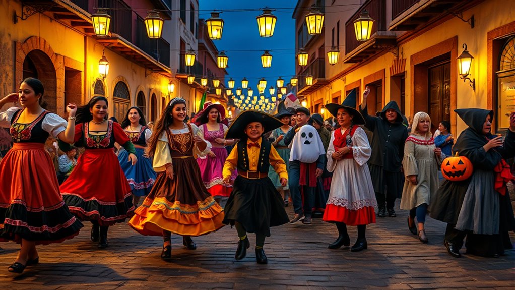 In Peru, Criolla Song Day celebrates cherished musical traditions that honor mestizo heritage through lively performances, traditional attire, and cultural pride. In contrast, Halloween emphasizes costumes, trick-or-treating, and spooky decorations influenced by North American customs. While Criolla Song Day preserves history and identity, Halloween reflects modern globalization and playful fun. Exploring these celebrations shows how Peru balances deep-rooted traditions with contemporary influences—if you keep looking, you’ll uncover even more about this vibrant cultural mix.