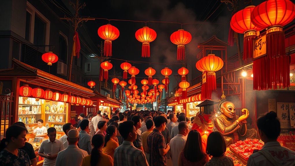 During the Hungry Ghost Festival in Asia, you see communities honoring restless spirits through elaborate rituals, offerings, and lively celebrations. People light incense, burn joss paper, and release floating lanterns to show respect and guarantee peace for the spirits. Streets and temples are decorated with colorful symbols, creating a vibrant atmosphere of tradition and spiritual harmony. To understand how this festival strengthens cultural bonds and deepens ancestral ties, keep exploring further details.