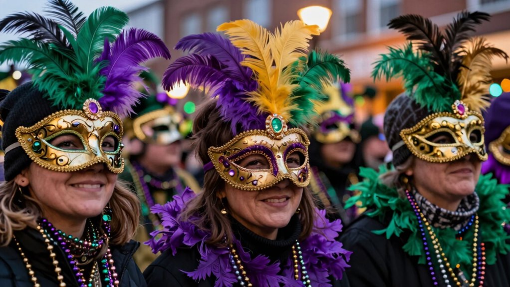 You might not know that mask-wearing in Mardi Gras traces back to history origins in 18th-century Europe, where masks allowed revelers to escape social constraints. The cultural significance grew as people embraced anonymity, encouraging free expression and equality among all participants. When this tradition reached New Orleans, it became a core part of Mardi Gras celebrations, symbolizing mystery, transformation, and shared community spirit that still thrives today.