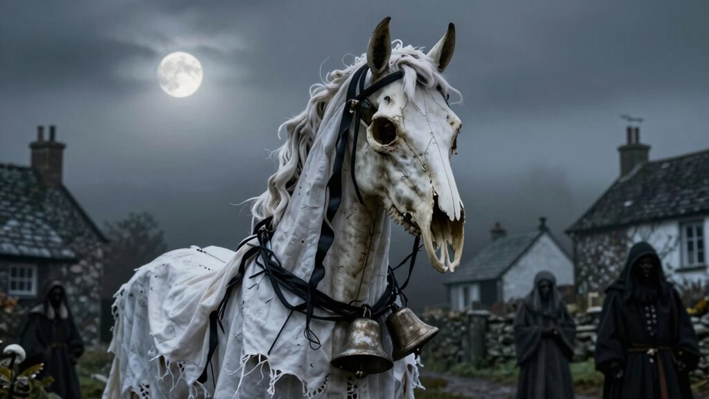 The Mari Lwyd is a spooky Welsh tradition where a decorated horse skull, mounted on a pole and covered with a white cloth, is carried around during winter festivities. People use it to engage in lively banter, singing, and riddles, blending storytelling with playful mischief. Its eerie, mask-like appearance can feel like Halloween, but it’s rooted in celebrating community, hope, and renewal amid winter’s gloom. Curious? You’ll discover more about this haunting yet lively custom below.