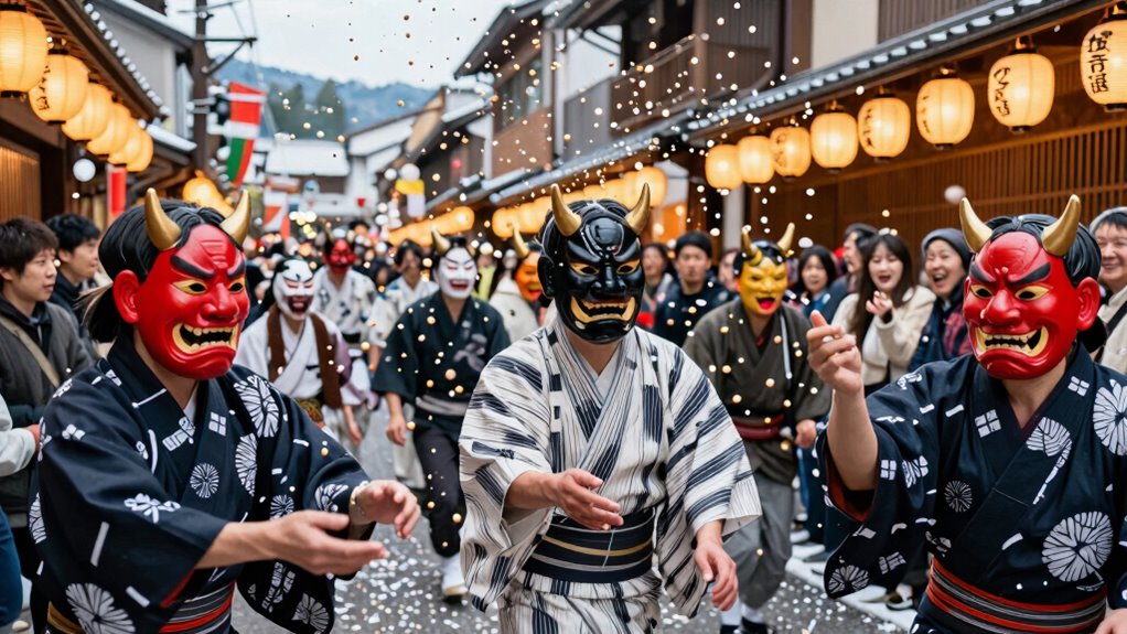 Setsubun is Japan’s vibrant festival where you join in warding off evil spirits and inviting good luck, similar to Halloween’s spooky spirit. You’ll throw roasted soybeans while shouting “Oni wa soto! Fuku wa uchi!” to chase away demons and welcome health and fortune. It’s full of lively rituals, colorful customs, and community spirit that create an energetic, festive atmosphere. If you keep exploring, you’ll discover the rich traditions behind this exciting cultural celebration.
