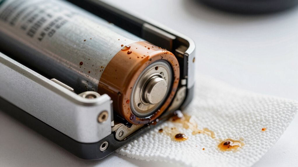 You’ll notice early battery leakage signs like corrosion around the terminals, a strange smell, or a cloudy, discolored substance. To prevent this, focus on corrosion prevention by storing batteries in a cool, dry place and removing them if unused for a long time. Regularly check your batteries and clean terminals gently. Proper storage tips can save your props from damage and extend battery life.