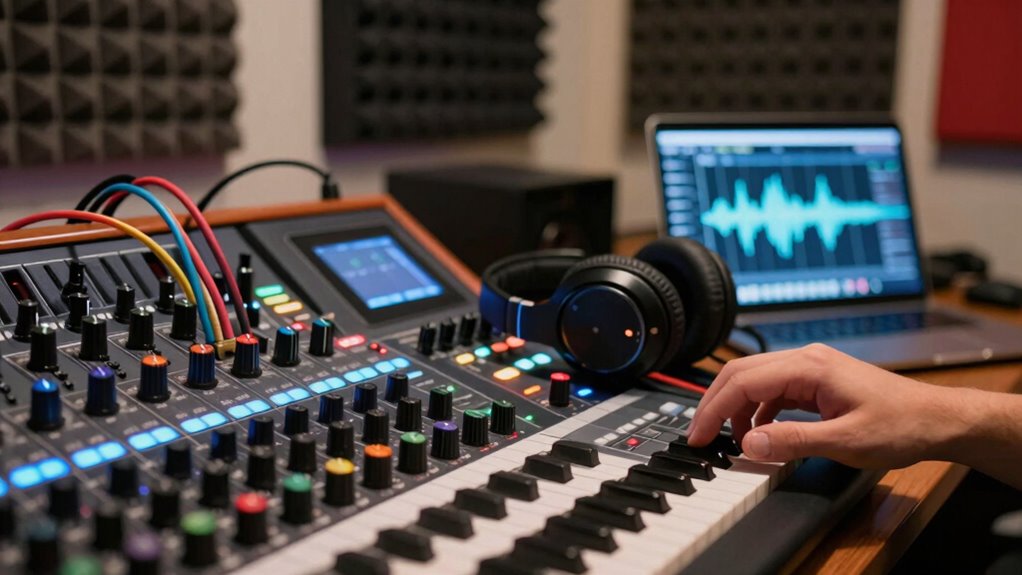 Adding vocals to your sound loops is like painting with sound, bringing your music to life. You should start by recording or sourcing vocal samples, then use vocal layering to create depth. Integrate lyrics seamlessly by adjusting timing and pitch to match your loop’s rhythm. Experiment with effects like reverb or delay to blend vocals smoothly, making sure they complement rather than overpower the existing sound.