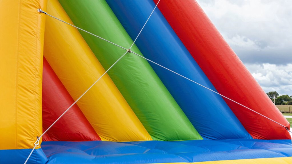 The first step in guaranteeing inflatable safety is to establish a robust anchoring system. You need to use high-quality stakes or weights, depending on the surface. Once your inflatable is secured, the next move is to focus on the tension of the tethers. This is where wind resistance techniques become essential. Instead of attaching all tethers directly to a single point, you create a triangular configuration for each anchor point. Picture a triangle: by connecting the tethers in this way, you distribute the tension more evenly across the inflatable’s surface, reducing the risk of tipping or tearing. This method effectively creates a stable, balanced structure that can better resist the force of the wind. Additionally, understanding the importance of proper tension in the tethers helps prevent accidents caused by slack or overly tight lines. Maintaining proper tension in each tether is essential—if they’re too loose, the inflatable can shift; if they’re too tight, it might cause undue stress on seams. Regularly checking and adjusting the tethers ensures maximum wind resistance performance. Proper tension also helps in distributing forces evenly across the inflatable, further enhancing stability. Incorporating proper planning based on weather conditions can also significantly improve setup safety. Being aware of wind speed and direction during setup allows for better adjustments to the tether system, increasing overall stability. Additionally, considering the type of surface where the inflatable is anchored can influence the choice of stakes or weights used, further improving stability under windy conditions.