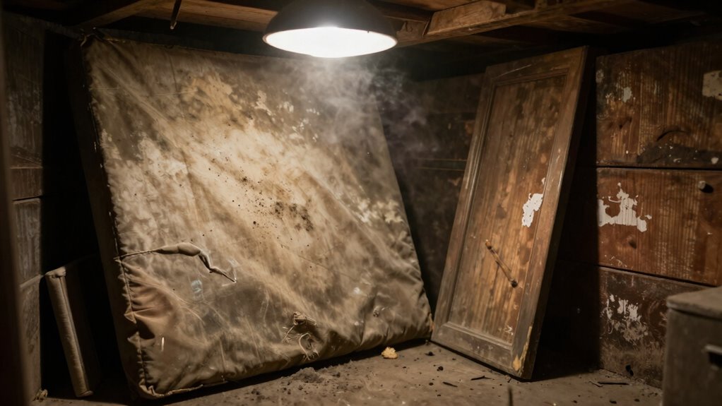 Basement smell in props occurs mainly due to moisture buildup, which encourages mold, mildew, and dampness. When you store props in damp, poorly ventilated areas, they absorb humidity and develop odors over time. To prevent this, control humidity levels, keep the space dry, and guarantee props are thoroughly dried before storage. Using airtight containers, moisture absorbers, and good air circulation can make a big difference. Keep going to uncover more effective tips.