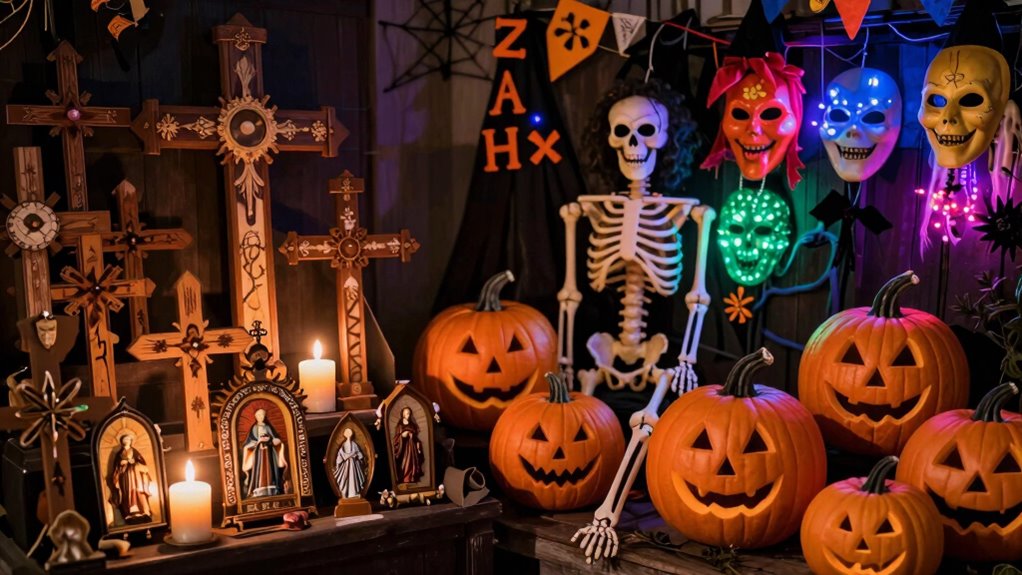 You’ll find that Allhallowtide and Halloween aren’t celebrated worldwide in the same way. Some countries observe the secular aspects of Halloween, like costumes and trick-or-treating, while others focus on the religious significance of Allhallowtide, honoring saints and the deceased. Cultural adaptation influences how these celebrations evolve, blending traditional practices with modern customs. So, your experience varies depending on local traditions and whether the focus is religious or secular.
