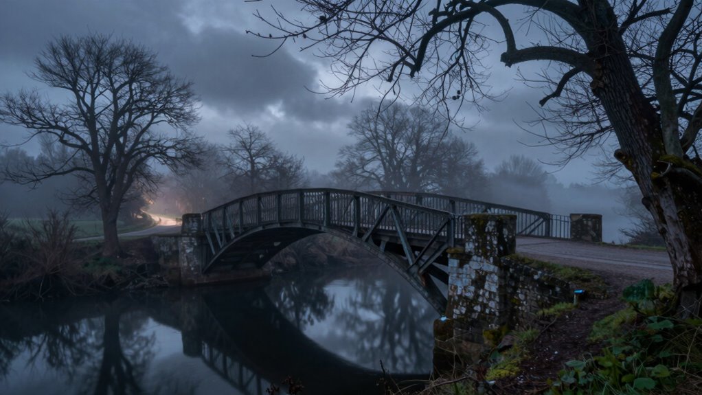 Like whispers carried by the wind, the most common spirits linked to bridges are often those of ghostly apparitions and restless spirits. You might encounter bridge apparitions—spectral figures seen lingering on the span—or experience sudden spirit sightings, where shadows flicker and vanish. These spirits are believed to be tied to tragic events or unfinished business, making bridges hotspots for supernatural activity that beckons curious or brave souls alike.