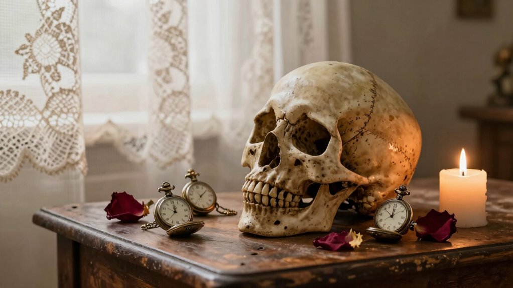 You should know that memento mori originated in ancient Rome and medieval Europe, where funeral rituals and artistic symbolism served to remind people of mortality. Artists used skulls and other symbols to encourage reflection on life’s fleeting nature. These reminders helped individuals focus on spiritual growth rather than material pursuits, turning mortality into a meaningful part of cultural and religious practices rather than something morbid.