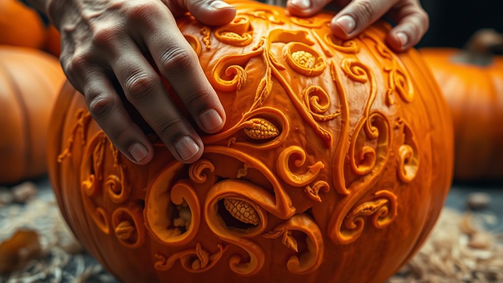 To elevate your pumpkin carving skills beyond basics, focus on intricate pattern techniques that require precision and patience, using fine tools for detailed designs. Try 3D sculpting to shape layers of pumpkin flesh into realistic figures or textures. Experiment with different materials like faux pumpkins and textured paints for contrast. Layer colors and carve depths to add dimension, and incorporate light and shadows for dramatic effects. Keep exploring these advanced methods to create truly stunning pumpkin art.