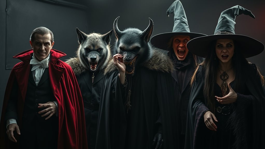 When designing vampires, werewolves, and witches, you draw on ancient roots of myth that reflect fears of death, disease, and the supernatural. Visual elements like fanged faces, sharp features, and dark, Gothic colors help convey their dangerous allure. Cultural influences shape their appearances and powers, from primal transformations to mystical spells. Understanding these origins and symbols can deepen your designs, and if you keep exploring, you’ll uncover even more secrets behind these iconic monsters.