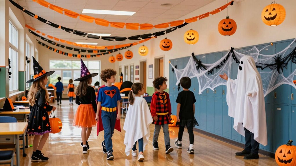 For classroom Halloween parties, you should focus on party planning that promotes inclusivity and fun. Check with teachers for specific guidelines, but generally, keep decorations age-appropriate and non-disruptive. Encourage costume creativity that respects all students, avoiding potentially offensive themes. Make sure treats are allergy-friendly and snacks follow school policies. Your goal is to create a safe, enjoyable environment where kids can celebrate Halloween together while following school rules.