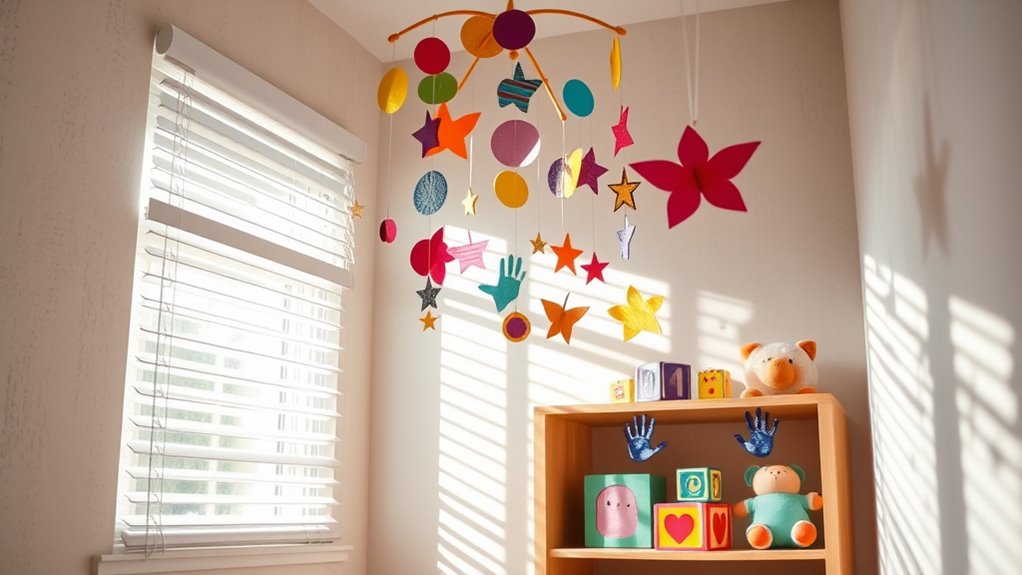 Personalized wall hangings and garlands instantly add a warm, playful touch to any room, reflecting your child’s personality and creativity. You can create DIY wall decals using simple materials like toddler friendly paint and adhesive vinyl. Let your child choose colors and designs to make the decor truly theirs. Crafting these personalized pieces is easy and fun—paint fun shapes or characters directly on the wall or on sturdy fabric, then hang them as banners or framed displays. Garlands made from painted paper or fabric can be personalized with your child’s name or favorite motifs. These decorations are lightweight, easy to move, and perfect for adding a touch of whimsy. Plus, involving your little one in the process makes the decor even more meaningful. Incorporating materials needed for candle making can inspire additional creative projects and enhance your child’s artistic space.