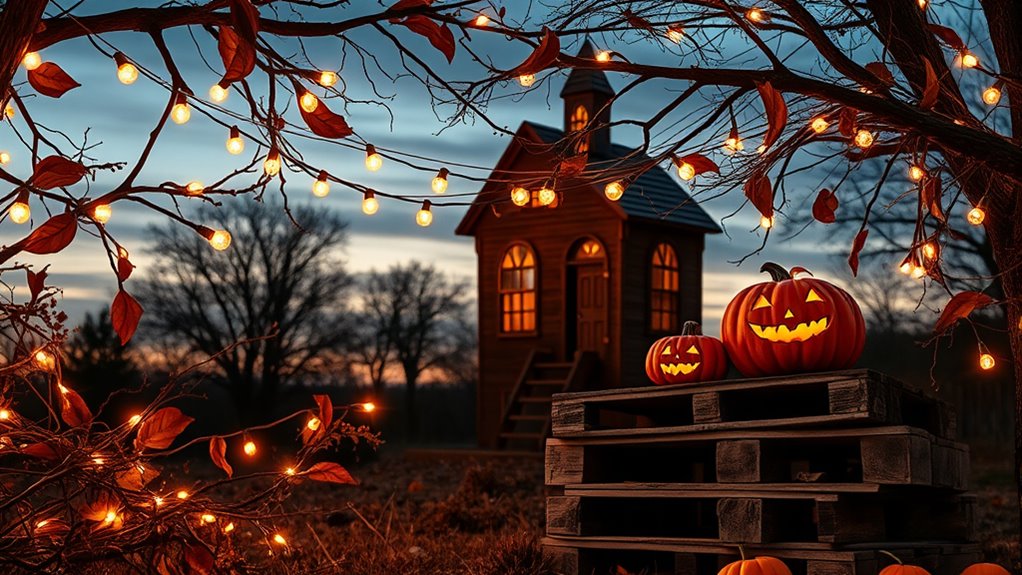 Constructing witch huts and haunted huts is a fun way to add a spooky centerpiece to your Halloween display. Use pallets to build small, crooked structures that fit seamlessly into your garden layouts. Incorporate uneven rooflines and twisted chimney stacks for an eerie effect. Enhance the atmosphere with outdoor lighting—think flickering LED candles or lanterns—to cast creepy shadows. Add details like broomsticks, cauldrons, and spooky windows to complete the look. Position your huts among overgrown plants or fallen leaves to create a haunted forest vibe. Use dark paint or stain pallets for aged, weathered walls. Remember, the goal is to make your huts look mysterious and invitingly spooky, perfect for trick-or-treaters and Halloween parties alike. Additionally, consider placement tips to ensure your spooky structures are both visible and safe for visitors.