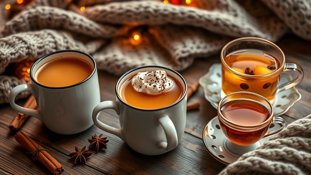 Yes, cider, cocoa, and tea offer health benefits. You’ll get antioxidant properties that help protect your cells from damage, reducing illness risk. Drinking these beverages may also support heart health benefits by improving circulation and lowering blood pressure. For the best results, choose natural, unsweetened options and enjoy them in moderation. Incorporating these drinks into your routine can boost your overall well-being while satisfying your taste buds.