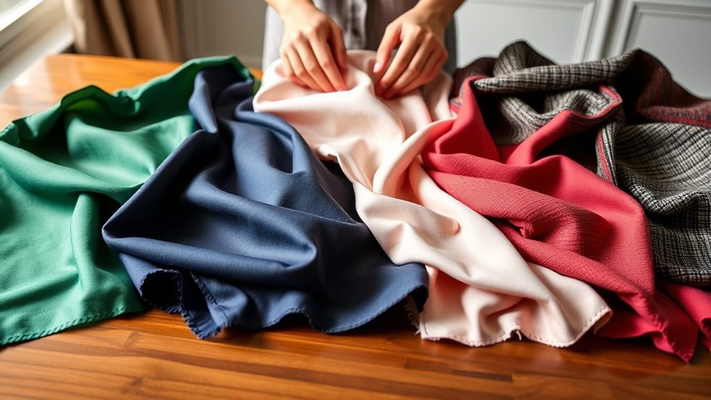Working with different fabric textures and weights requires careful handling to achieve the best results. When fabric manipulation, such as gathering or draping, you need to take into account the fabric’s texture and weight to prevent distortion or damage. Match textures when combining fabrics in a design to ensure a cohesive look and avoid clashing. For example, pair lightweight silk with delicate lace, and heavier fabrics like denim with sturdier textiles. When working with textured fabrics, handle them gently to preserve their surface detail. Adjust your sewing techniques—using finer stitches for delicate fabrics and more robust stitches for heavier ones. Proper texture matching and mindful fabric manipulation help you create polished, professional costumes that hold their shape and look great. Additionally, understanding how different fabrics respond to fabric care can help maintain their appearance over time.