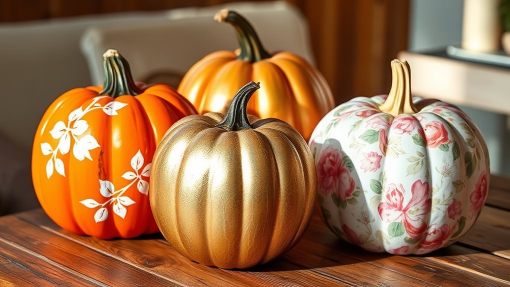 No-carve pumpkins let you create gorgeous fall decor using paint, decoupage, and wrapping techniques that are easy and mess-free. You can choose from vibrant paints, decorative papers, and textured wraps to personalize your pumpkins for Halloween or autumn displays. Focus on selecting the right materials and tools for durability and style. For tips on decorating, sealing, and showing off your designs, keep exploring—you’ll find ideas to make your pumpkins truly stand out.