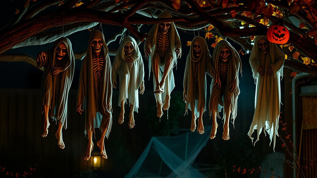 If you’re looking to amp up your Halloween decorations, I’ve got the perfect list of 15 animatronic hanging ghouls. These eerie decorations range from life-size grim reapers to spooky swinging dolls, each equipped with fantastic features like glowing eyes and sound effects. They’re not just eye-catching but also create an immersive scare experience. Want to discover the best options and what to weigh when choosing your ghouls? Let’s get into it!