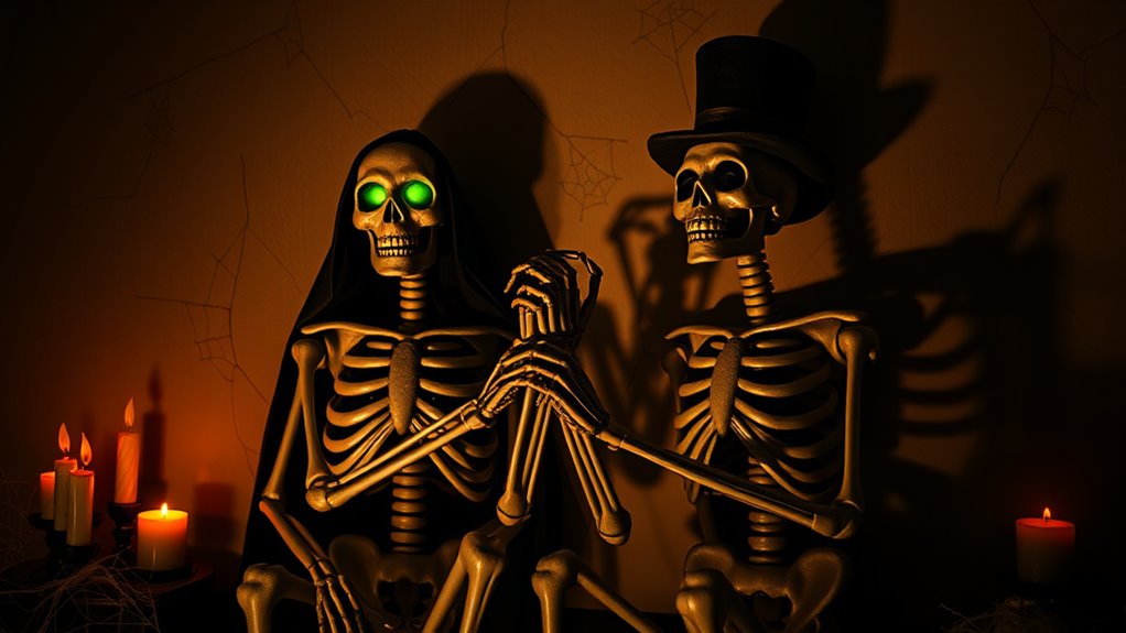Choosing the right size and height for your animatronic skeleton duo is crucial, as it can considerably impact your display’s overall effectiveness. I recommend aiming for a height between 3 to 8 feet tall for maximum visibility. Make sure the size fits comfortably in your intended space—whether indoors or outdoors—without feeling overwhelming or too small. It’s also worth checking if the skeletons are adjustable or poseable; this flexibility allows you to customize their stance for various themes. Keep in mind that larger skeletons might need more robust support to prevent tipping, especially outdoors. Finally, ensure the size matches other decorations to create a cohesive and visually impactful Halloween scene that truly captivates your guests.