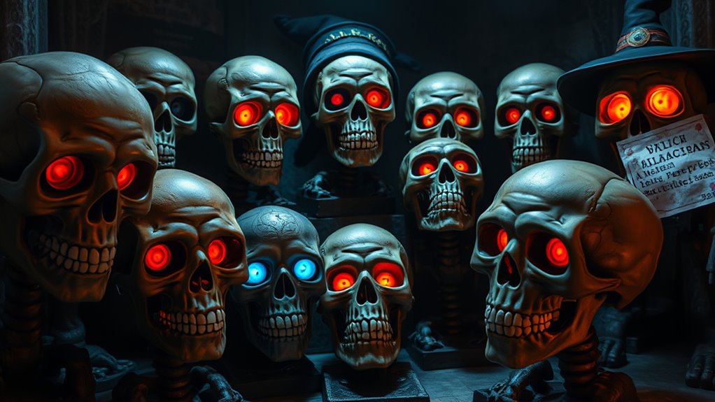 If you’re looking to elevate your Halloween decor, I’ve found the 15 best animatronic talking skulls that’ll do just that. These spooky decorations feature realistic designs, motion sensors, and impressive sound effects that truly bring a frightful atmosphere to life! From hanging skulls to life-sized pirate ghosts, there’s something for every setup. Plus, their durable materials assure they’ll last through multiple seasons. Stick around to discover which options are perfect for your haunted house!