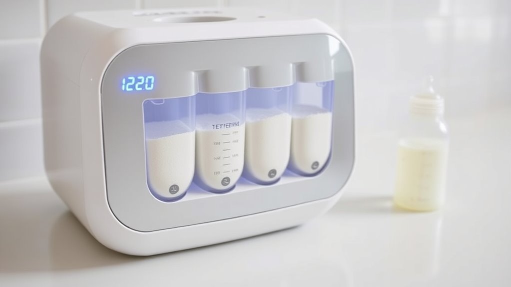 Choosing the right baby formula dispenser is like finding the perfect recipe—precision and timing are everything. I remember once rushing to warm a bottle, only to realize I’d missed the ideal temperature, causing unnecessary stress. That’s why I appreciate dispensers with temperature control; they make feeding safer and more convenient. With the right device, you’ll feel confident, knowing your little one’s meal is just right—like a chef perfecting their signature dish every time.