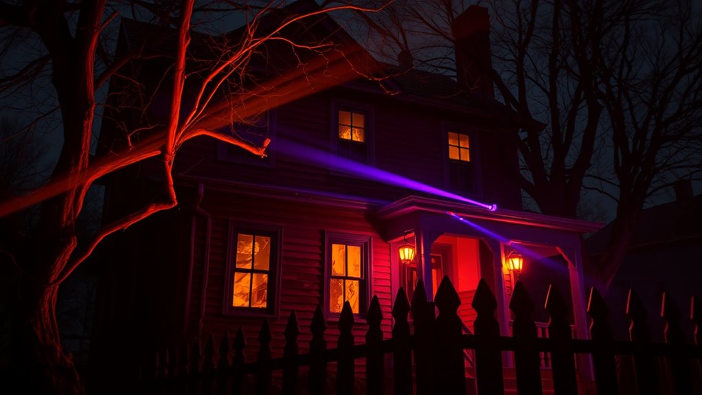 Choosing uplights that are easy to operate can make setting up your Halloween display much more straightforward. Look for models with intuitive controls, like remote or app-based operation, so you can make adjustments without needing technical skills. User-friendly interfaces with straightforward buttons or simple menus help you switch modes quickly, saving you time and frustration. Wireless operation is a big plus, eliminating the hassle of complicated wiring or manual setup. Clear instructions or manuals are essential, guiding you step-by-step and minimizing the learning curve. Additionally, preset modes and automated functions make it easier for beginners to operate the lights effectively, ensuring your haunted house shines without any hassle. Prioritizing ease of operation guarantees a smooth setup process and a stunning Halloween display.