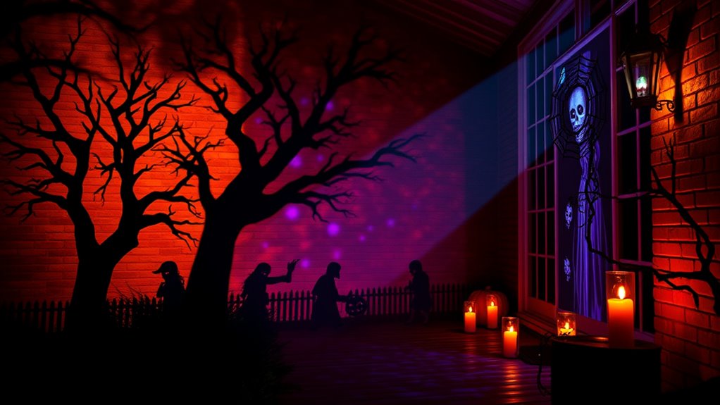 Yes, I look for projectors with high contrast ratios and vivid color capabilities to create eerie, eye-catching effects. Features like built-in image warping or edge blending help me project spooky scenes on irregular surfaces, enhancing the creepy atmosphere. I also prioritize models with adjustable focus and keystone correction, so I can fine-tune the images for maximum impact and guarantee my Halloween display is as haunting as possible.