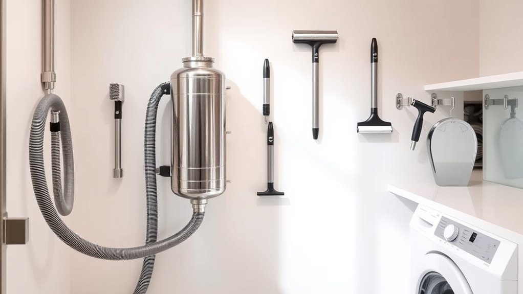 You’ll need a few essential tools for installing a central vacuum system. I always start with a drill and hole saw to create wall and floor openings. A stud finder helps locate studs and avoid wiring. I also use a tape measure and level to guarantee proper placement. Additionally, a screwdriver, utility knife, and caulk or sealant are helpful for securing connections and sealing gaps. These tools make the process straightforward and efficient.