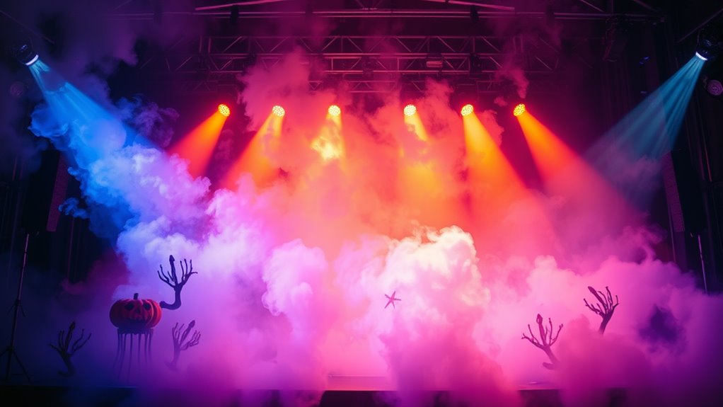 If you want to wow your Halloween stage with dramatic CO2 effects, I recommend exploring some top options like handheld CO2 jets with RGB LED lights, large fog cannons with impressive spray distances, and powerful professional units that blend lighting and fog perfectly. These machines are lightweight, easy to operate, and create impactful visuals that will spook and impress your audience. Keep going to discover the best choices suited for your spooky event.