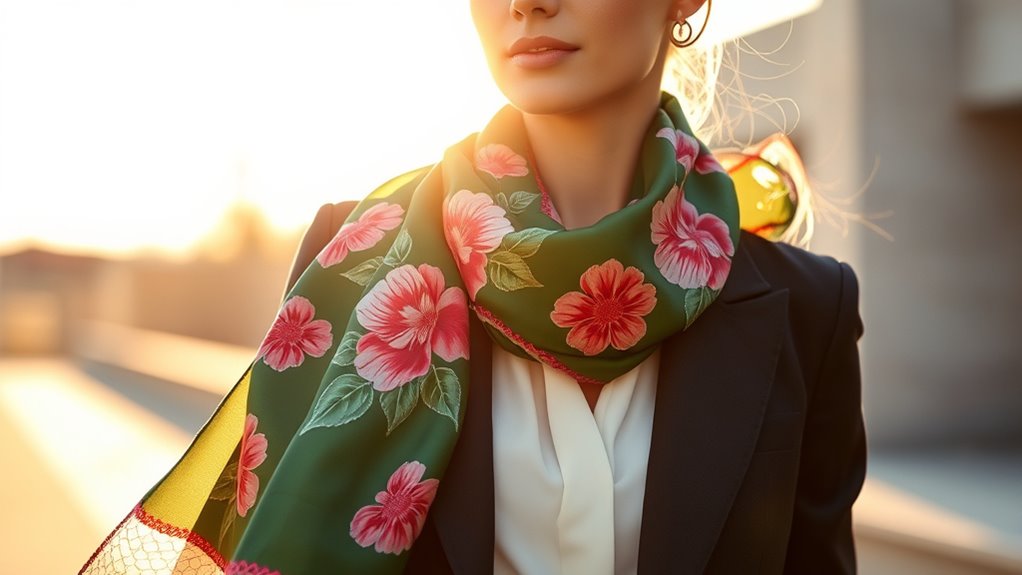 Selecting the right size of a designer scarf is essential to guarantee it fits your styling needs and complements your wardrobe. Larger scarves (over 70 inches) are perfect for draping and creating bold, layered looks, while smaller ones (around 27-35 inches) serve as lightweight accessories or neck scarves. Versatility is key, so look for scarves with reversible patterns or multiple styling options—these can double as head wraps, bag accents, or shawls. Pay attention to fabric weight and drape; silk or satin scarves are elegant for tying knots, whereas heavier materials work well as wraps. Ensure the dimensions allow for various styling techniques like twisting or knotting, maximizing wearability across different seasons and occasions. A versatile, well-sized scarf truly elevates your outfit.