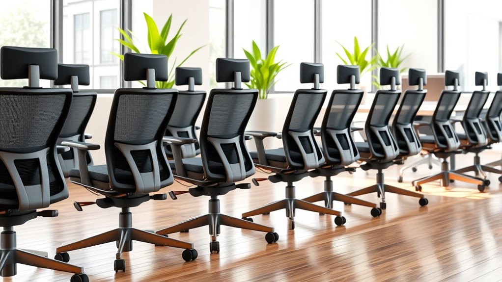 Space-saving features are essential when selecting an ergonomic office chair, especially in smaller workspaces. I look for chairs with flip-up or foldable armrests that reduce their footprint when not in use. Adjustable or retractable footrests are also helpful, allowing me to store them easily under my desk and free up space. Compact designs with slim profiles or stackable options enable me to save room by stacking multiple chairs when needed. Chairs with adjustable height and tilt functions fit better under desks or into tight corners, maximizing space efficiency. Additionally, lightweight models with smooth-rolling wheels make repositioning effortless, helping me navigate confined areas without hassle. Choosing a chair with these space-saving features ensures my workspace stays open, organized, and functional.