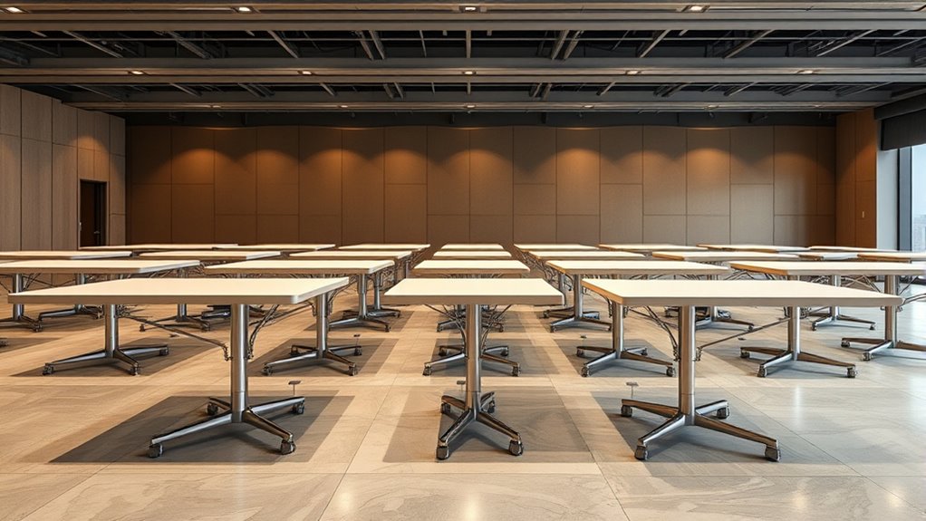 Choosing a folding banquet table that can handle your needs starts with paying close attention to its weight capacity. You want a table that can support the maximum load you expect without risking damage. Heavy-duty models typically range from 300 to 1,000 pounds, so it’s essential to check the manufacturer’s specifications for the maximum distributed weight. The table’s legs and frame are vital too, as they provide stability under heavy loads. Overloading can cause deformation, wobbling, or even structural failure, which compromises safety and usability. If you plan to use the table for heavy equipment, large gatherings, or stacking items, opt for one with a higher weight capacity to guarantee long-term durability and peace of mind during use.