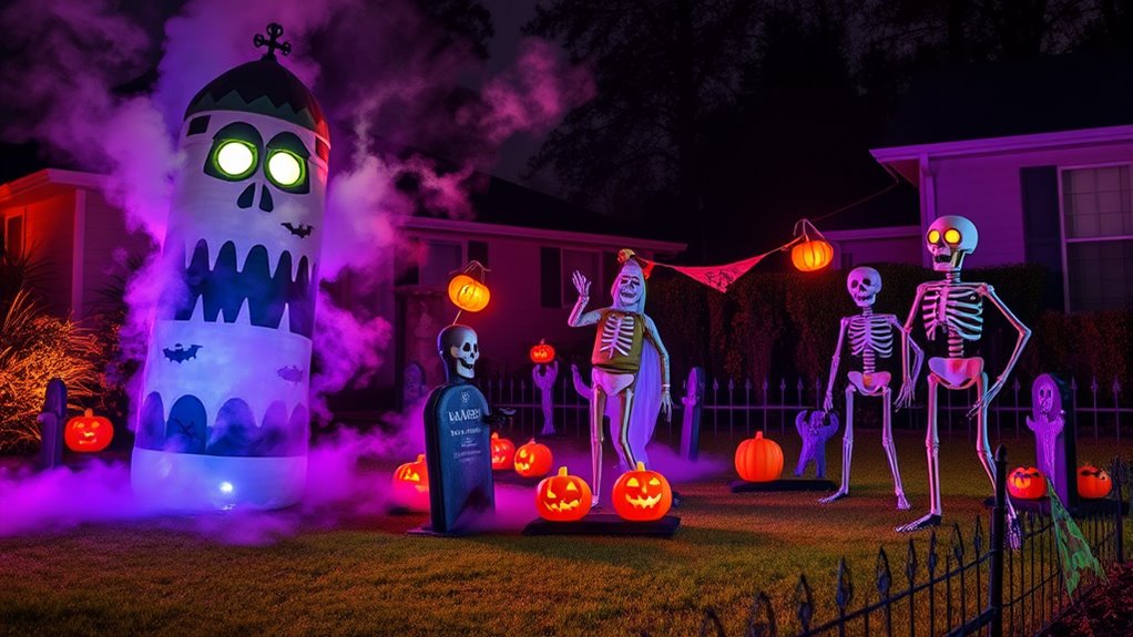 Bright LED lights are essential for making your inflatable graveyard stand out at night. They create a spooky glow that draws attention and enhances visibility, especially with white or colored LEDs. Internal lighting effects, like flashing, steady, or color-changing LEDs, add dynamic, eye-catching illumination that makes your decorations pop. Many inflatables have built-in LEDs integrated into tombstones or ghost figures to emphasize creepy details. Strategic lighting highlights features like skulls or gravestones, intensifying the haunted atmosphere. Just confirm your lighting is properly secured to prevent safety hazards and electrical issues, especially when using multiple inflatables outdoors. Thoughtful lighting effects can truly transform your yard into a terrifyingly festive scene, making your decorations unforgettable.