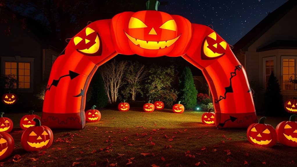 Bright LED lights are a must-have feature for Halloween inflatable pumpkin arches because they markedly boost visibility and create an enticing spooky glow at night. The placement and number of LEDs, whether built-in white or multicolor, greatly influence the arch’s visual impact and festive vibe. Waterproof LEDs are especially important, ensuring the lights stay on safely, even in rain or damp conditions. You can choose between color-changing options or static lights, allowing you to set different moods—eerier or more cheerful—depending on your theme. Properly integrated lighting effects not only enhance the overall look but also help your inflatable stand out as a mesmerizing focal point during your nighttime celebrations. Lighting truly transforms your yard into a spooky, eye-catching spectacle.