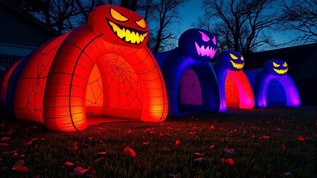 Looking to spook your yard in 2025? I recommend checking out the top inflatable tunnels like the 12ft LED archways, spooky haunted house designs, and 8ft infinity tunnel features that combine bright lights, detailed themes, and weatherproof construction. Larger sizes create a bold haunted scene, while smaller ones fit tight spaces. Lighting effects and quick setup make these an easy way to wow neighbors and trick-or-treaters. If you’re curious about the best options, stay tuned for all the details.