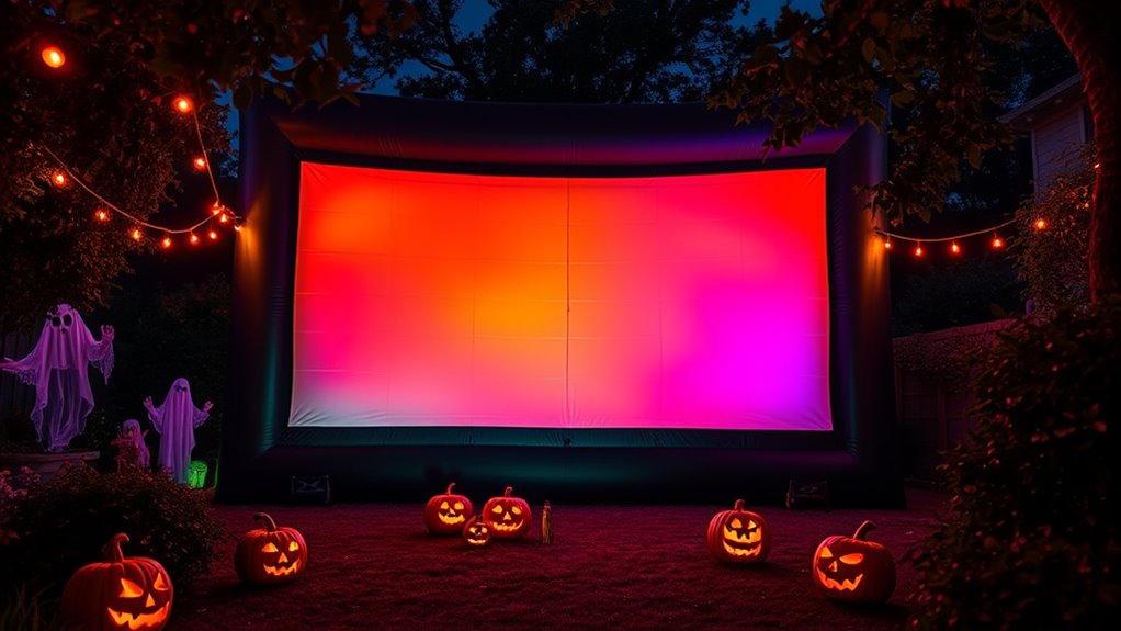 If you want to make your Halloween movie night truly unforgettable, inflatables are the way to go. I’ve found that sizes ranging from 14 to 24 feet offer plenty of projection space for spooky visuals, and quick setup makes spontaneous fun easy. Durable materials and weather resistance guarantee they last through the season, while portability helps your outdoor party move smoothly. Keep exploring to discover which inflatable screen best fits your haunted yard plans.
