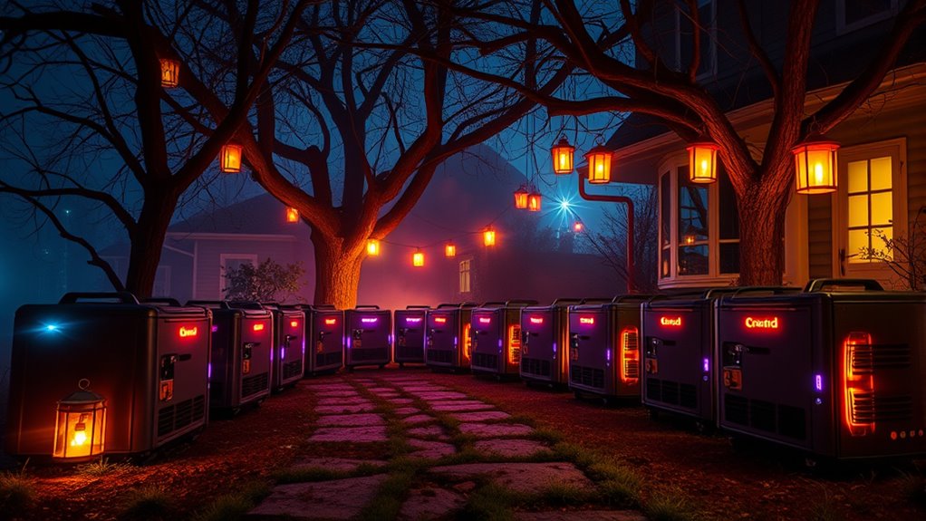 Choosing an inverter generator that’s easy to operate can make your Halloween yard haunt setup much smoother. An electric start feature allows for quick, effortless power-ups, saving you time during busy preparations. Clear, accessible control panels with intuitive switches and indicator lights help you manage power output and monitor system status without confusion. Lightweight and portable designs, often with built-in handles or wheels, make it simple to transport and position the generator exactly where you need it. Automatic safety features, like low-oil shutdown, overload protection, and carbon monoxide sensors, provide peace of mind and reduce maintenance worries. Plus, quiet operation—typically under 60 decibels—keeps noise minimal, so you can enjoy your haunt without loud interruptions or disturbances.