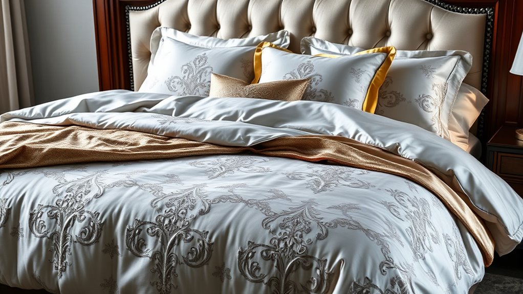 The design and style of your luxury bedding set play a crucial role in creating a cohesive and inviting bedroom aesthetic. I recommend choosing patterns that complement your decor, like geometric, floral, or damask motifs, to enhance visual harmony. Pay attention to the color scheme and how it coordinates with your furniture, wall colors, and accent pieces for a seamless look. Select a style that reflects your personal taste, whether modern, traditional, boho, or transitional, for lasting satisfaction. Decorative elements such as embroidery, pleating, tufting, or piping add texture and visual interest, elevating the overall design. Above all, choose a pattern that balances elegance and functionality, ensuring your bedding not only looks stunning but also enhances comfort and versatility.