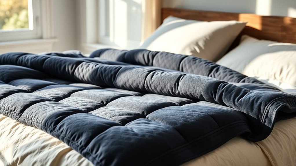 Choosing the right material is essential for guaranteeing a comfortable night’s sleep with a weighted blanket. High-quality blankets are made from breathable fabrics like cotton, microfiber, or bamboo, which promote airflow and prevent overheating. Breathability helps regulate your body temperature, reducing sweating and discomfort as you sleep. Many premium blankets also feature moisture-wicking and quick-drying properties, enhancing overall comfort and hygiene. Well-designed blankets often include layered compartments, such as 5×5 sections, that evenly distribute weight and facilitate airflow. Additionally, selecting hypoallergenic and skin-friendly materials minimizes irritation, making the blanket suitable for sensitive skin. Prioritizing material quality and breathability ensures you stay comfortable throughout the night, supporting better sleep and overall well-being.