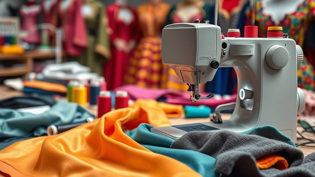 Selecting a serger that can handle a variety of fabrics is essential for creating versatile cosplay and costume projects. You want a machine that supports delicate silks, stretchy spandex, heavy denim, and even leather, so your options stay open. Check if it has adjustable differential feed to prevent puckering on lightweight fabrics and to gather or ease heavier textiles. Multiple thread options—2, 3, or 4—give you flexibility for different stitch styles and fabric weights. Also, consider the blade and cutting width; they should handle thicker materials like upholstery or layered fabrics without sacrificing seam quality. Lastly, if you’re working with specialty textiles like metallics or sequined fabrics, ensure the serger can accommodate these with proper tension adjustments or reinforced stitching.