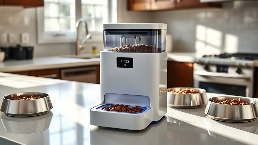 Adding extra features to a smart pet feeder can substantially enhance how you interact with and care for your pet. Built-in cameras, voice recording, and two-way audio let you monitor your pet and even talk to them during mealtime, making the experience more engaging. Sensors that detect food blockages, low food levels, or pet presence improve safety and guarantee your pet always gets fed properly. Smart notifications keep you informed about refilling or cleaning, preventing malfunctions. Compatibility with smartphones, tablets, and voice assistants offers flexible control over feeding schedules, fitting seamlessly into your routine. Features like desiccant bags, sealing strips, and stainless steel components also help maintain freshness and hygiene. These added features make smart feeders not just convenient but reliable and pet-friendly.