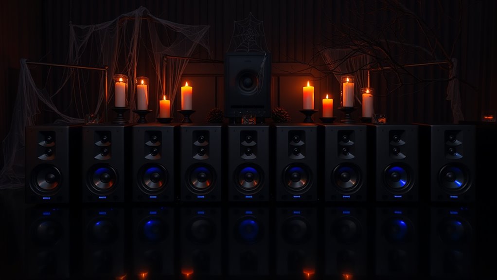 When selecting studio monitors for Halloween sound design, customization controls play a essential role in achieving the perfect spooky atmosphere. Features like high- and low-frequency tuning let me adjust the sound response to match my room’s acoustics and personal preferences. Adjustable tone knobs or equalizer settings enable me to craft immersive, eerie soundscapes indispensable for Halloween projects. Some monitors offer room tuning or calibration controls, helping optimize sound quality and stereo imaging for my environment. Dedicated switches or dials for different modes or placements ensure consistent performance, even when I move the monitors around. These fine-tuning options are critical for achieving accurate sound staging and clarity, allowing me to create haunting, detailed sound design that truly immerses listeners in the Halloween mood.