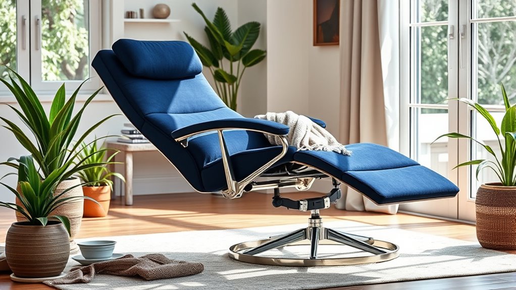 Selecting a zero-gravity recliner that truly meets your comfort needs means paying close attention to its adjustability features. Look for chairs with multiple adjustable support points—headrests, lumbar support, and footrests—so you can customize your comfort precisely. Confirm the recliner offers a range of recline positions, whether infinite or multiple preset angles, allowing you to find the perfect position for reading, relaxing, or napping. Easy-to-use controls, like remote controls or touch buttons, make adjustments smooth and effortless. Check if the recliner has memory functions to save your favorite positions for quick access. Finally, consider the maximum recline angle—up to 160° or more—for ideal weight distribution and relaxation. These features ensure you get the most personalized, comfortable experience.