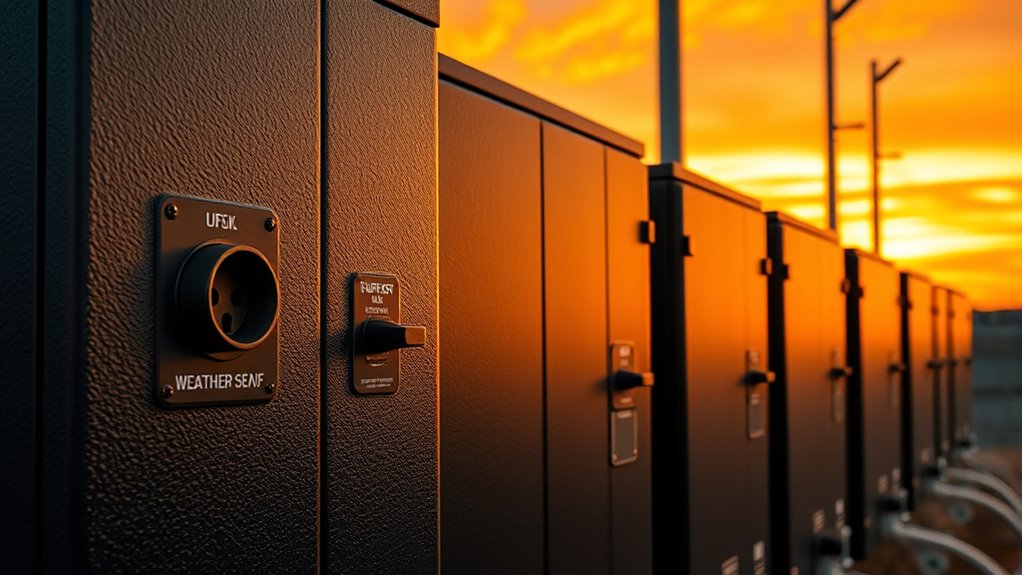 Think of weatherproof seals as the guardians of your power box—they need regular checkups to stay fierce. I recommend inspecting them every six months, especially after harsh storms or extreme weather. If you notice cracks, brittleness, or wear, it’s time to substitute them. Keeping these seals in top shape ensures your power distribution remains watertight and protected, giving you peace of mind no matter what Mother Nature throws your way.