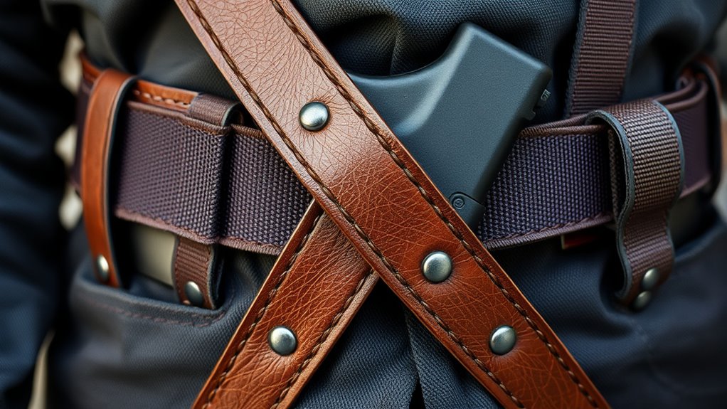 When selecting materials for your rig, it’s essential to prioritize durability and comfort. Your belt should be sturdy enough to support your gear without sagging, and comfortable enough for extended wear. Consider how belt aesthetics impact your overall look; a sleek, high-quality leather belt can elevate your appearance, while a rugged nylon offers practicality. Holster color coordination matters too—matching or complementing your belt’s shade creates a cohesive look. Choose materials that resist wear and tear, ensuring longevity and consistent style. Additionally, embracing attention during the selection process helps you make more informed and satisfying choices. Avoid flimsy options that may compromise safety or comfort. By focusing on durable, comfortable materials with thoughtful belt aesthetics and holster color coordination, you’ll build a rig that’s both functional and visually appealing.