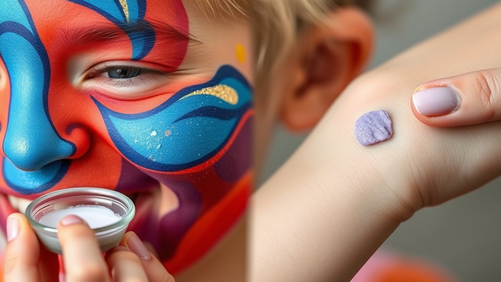 Performing a patch test is an essential step to guarantee that the face paint won’t cause an allergic reaction or irritation. To do this effectively, choose a small, discreet area of skin, like behind the ear or on the inner forearm. Use a minimal amount of the cosmetic formulation, focusing on the ingredients you sourced carefully. Remember, ingredient sourcing impacts safety, so verify the products are from reputable suppliers. Keep the test area clean and dry, and wait at least 24 hours before checking for any reactions.